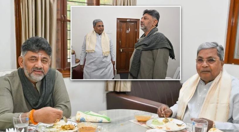 कर्नाटक की सत्ताधारी कांग्रेस पार्टी में जारी अंदरूनी कलह पर लगाम लगाने के लिए आज शनिवार को एक महत्वपूर्ण घटनाक्रम सामने आया। मुख्यमंत्री सिद्धारमैया और उपमुख्यमंत्री डीके शिवकुमार ने मुख्यमंत्री के सरकारी आवास 'कावेरी' पर नाश्ते पर मुलाकात की। नाश्ते के बाद दोनों शीर्ष नेताओं के बीच एक घंटे तक बैठक चली।